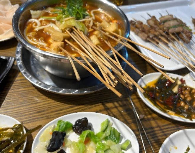 166燒烤涮肚專注涮肚燒烤11年,所以更專業(yè)。辣紅的鍋底在配上素菜,放進金錢肚,燒開之后香氣撲鼻。涮出來的毛肚麻辣鮮香,辣而不燥,不上火,不口干。東北特色霸氣吊爐炭燒,把腌制好的食材懸掛在壁邊,明火恒溫烤制,穩(wěn)穩(wěn)鎖住肉肉的汁水,一出爐就色香俱全。辣鹵,光看上面的辣椒都感覺辣。泡在蒜香的醬汁里,想不入味都難。海帶菜,木耳,藕片,土豆片,東北常見食材,蒜香濃郁,咸辣開胃。無味不致,香氣四溢,小板筋鮮嫩可口,Q彈緊致,配合芝麻甜醬,真有小時候的味道!