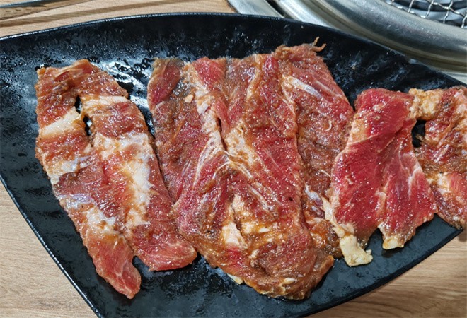 半酒窩朝鮮家庭烤牛肉的長白山黑豬厚切五花在烤盤上烤至金黃但不焦的色澤,油脂在火焰的晃動中“滋滋”析出,吃起來一點(diǎn)都不膩,十分脆口!贈送的花邊生菜經(jīng)過精挑細(xì)選才能上桌,又嫩又新鮮的生菜包裹上幾片五花肉,夾上蒜瓣辣椒,真香!黃牛肉雪花板腱細(xì)膩均勻的雪花紋路漂亮,等級至少達(dá)到了M5!烤前撒上喜馬拉雅玫瑰鹽調(diào)味,配合果木炭的清香,唇齒之間盡是濃郁的奶香,原汁原味就足夠迷人!