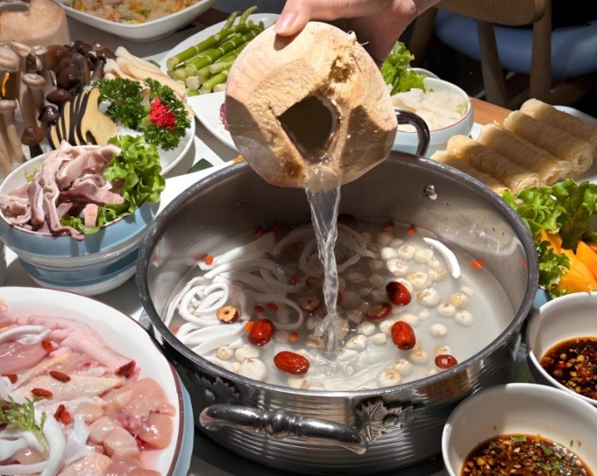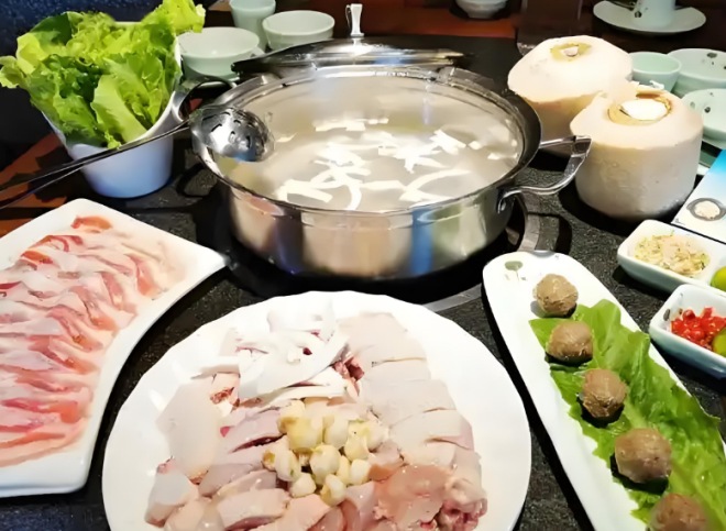 常潤椰子雞將四個椰子作為鍋底,清甜不膩,讓人忍不住多喝幾碗。椰子雞火鍋湯底是現開椰青水煮的,清甜到想喝三碗!雞肉彈嫩不柴,蘸上沙姜+小青檸調的靈魂蘸料,咸鮮里透出椰香。