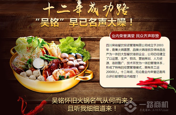 吳銘火鍋2003年創建于重慶,譽滿蜀川的火鍋品牌,2006年8月,總部移師成都。吳銘火鍋積極推進餐飲相關產業開發,“吳銘宴酒”、“吳銘毛肚”、“吳銘雞精”、“吳銘味精”、“吳銘香料”已經面市并獲得良好的市場回應。