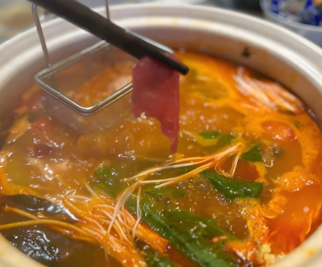 滇南里現(xiàn)舂鮮貨火鍋肉眼可見的新鮮,紋理清晰、色澤紅潤,往酸辣鍋里一涮,幾秒就熟,入口嫩到不行,帶著鍋底的酸辣味,嚼勁十足又不柴,能吃出來是當(dāng)天現(xiàn)切的好肉,牛肉愛好者直接沖就完事兒!