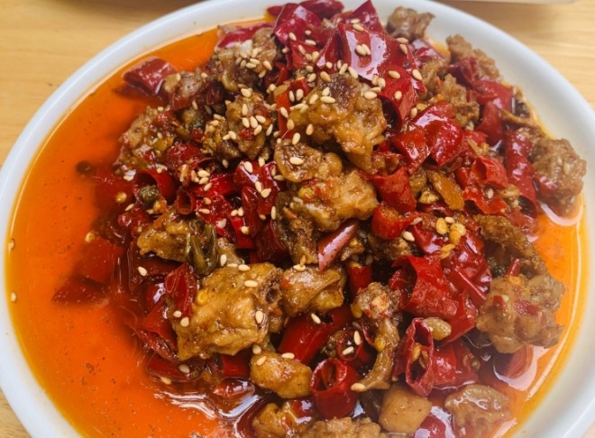 鄧雙雙自貢燒烤鹽幫菜的歌樂山辣子雞雞肉被炸得外酥里嫩,色澤金黃,和辣椒、花椒一起翻炒,香味四溢。雖然辣椒很多,但雞肉也不少,在辣椒堆里找雞肉的快樂誰懂!每一塊雞肉都裹滿了香辣調料,一口下去,麻麻辣辣,超級過癮!除了這些硬菜,川北涼粉、燒椒皮蛋等涼菜也很值得一試,清爽解膩,完美搭配熱辣的主菜。