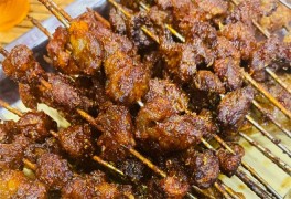 推開金郡大自然玻璃門的瞬間,混合著孜然、辣椒與烤肉的香氣撲面而來。明檔里,師傅們正麻利地翻動著滋滋作響的肉串,火星四濺中,油脂滴落在炭火上,升騰起令人垂涎的煙霧。招牌的羊肉串選用甘肅本地羊后腿肉,肥瘦相間,炭火逼出油脂的焦香,撒上一把蘭州特有的粗粒孜然,入口鮮嫩多汁,毫無膻味。除了傳統烤肉,這里還能嘗到地道的蘭州風味。烤羊肚脆嫩彈牙,烤板筋嚼勁十足,而那一盤炒面片更是隱藏菜單上的明星——寬面片裹著油潑辣子的香氣,配上幾串烤肉,就是最地道的蘭州"肉面"組合。