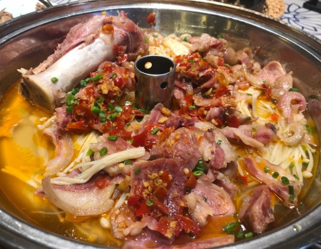 伏羊村徐州菜的銅鍋羊肉和宮廷羊雜中的羊肉、羊雜都是細膩鮮美,從湯汁中撈起很誘人,分量很足,滿滿一鍋足夠吃撐兩個人,“為人善良方得食,有羊無魚不成鮮。”
