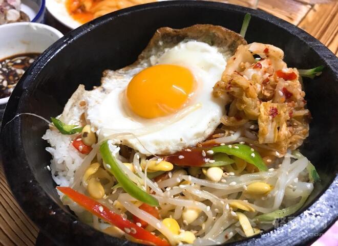 它的發源地為韓國全州,后來演變為韓國的代表性食物。在石鍋鍋內放入米飯及菜肴,再烤到鍋底有一層鍋巴,噴香誘人,石鍋是陶做成的,厚重的黑色陶鍋可直接拿到爐具烹煮,而且保溫效果好。細嚼慢咽的人可安心享用,不用怕飯菜冷掉。