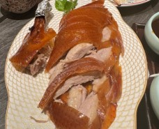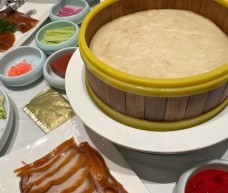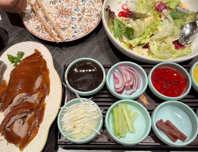 錦爐酥皮烤鴨有獨特的跳跳糖和酸梅醬蘸鴨皮的吃法,值得一試。烤鴨一共三盤:一盤鴨皮,一盤鴨皮+鴨腿,一盤烤鴨肉。烤鴨腸卷上烤鴨、黃瓜和蔥絲,吃到嘴里美滋滋。