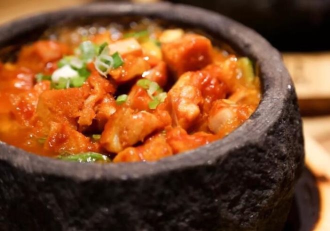 2、視覺沖擊強:外焦里嫩的雞肉和配菜放入剛剛經過高溫蒸熱的石鍋,迅速澆入顧客想要的料汁口味,菜和肉在沸騰料汁的作用下泡泡泛起,濃香四溢,將人的視覺嗅覺味覺都帶動起來了,讓顧客欲罷不能。