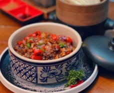 雀舞云南菜的特色菜是竹笙汽鍋雞,在制作時不加一滴水,出鍋時卻是一鍋香氣馥郁,入口鮮香毫無油煙膩之感的雞湯。這道菜的關鍵便是紫砂汽鍋,它作用非常神奇,在蒸制時,水蒸氣從汽鍋的孔內魚貫而入,將雞肉的鮮美蒸出來,再次形成水氣,慢慢的溢滿汽鍋,經過六個多小時的蒸制,后匯聚出滿滿一鍋汽鍋雞湯。再配上鮮嫩的筍片、脆爽的竹蓀、嫩滑的香菇和翠綠的苦瓜,撒上把紅紅的枸杞,可謂色香味俱全。