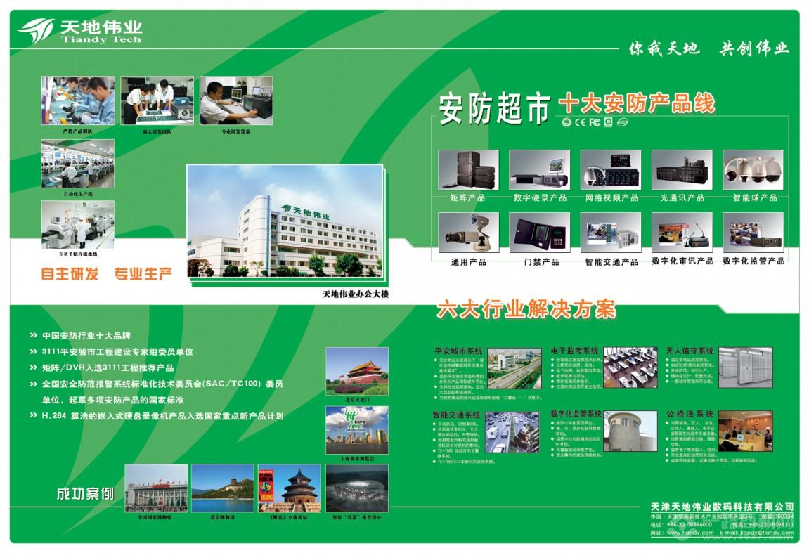 天地偉業公司不斷加強對研發技術的投入和研發體系的完善,充分發揮多產品線的優勢,提供多行業應用解決方案,針對不同行業的特殊需求不斷推出具有獨立性、針對性、領先性的軟硬件產品,如平安城市系統、智能交通系統、數字化審訊系統、數字化庭審系統、數字化監管指揮系統、電子監考系統、電力監控系統、 通信監控系統、環保監控系統、森林防火監控系統、鐵路綜合監控系統等行業解決方案及配套設備。公司以一流的管理水準、精品化的產品及穩定的營銷網絡,正成為系統配套最完善、產品系列最齊全的產品制造商,贏得了市場與客戶的普遍認同。