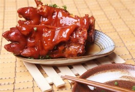 蹄行官豬蹄的用料非常講究,采用精選的肥瘦適中的豬后腿為原料,加入配料,再加水放入大號的砂鍋,火候以文火為主,經過一天一夜的煨煮和蒸燜,煮熟的豬蹄熱氣騰騰,外形飽滿,皮色醬紅,香氣四溢。