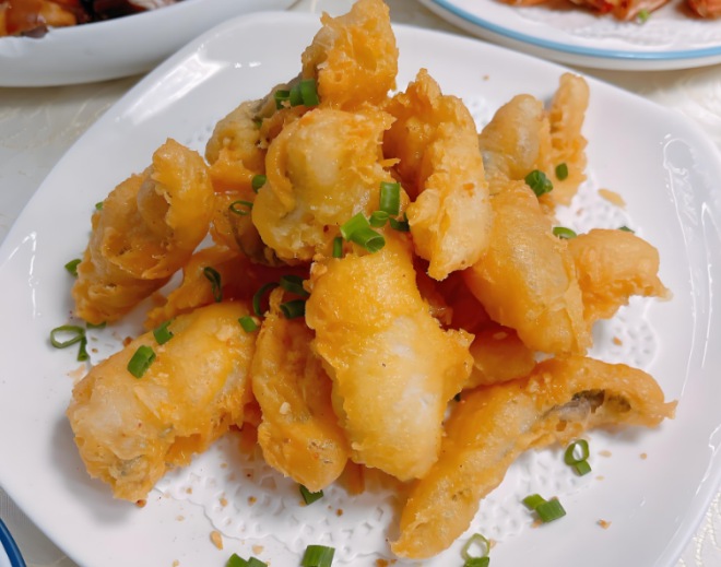 小煵記深圳本地菜的椒鹽九肚魚這是一道在廣東尤其是沿海的地方非常經典和常見的海鮮料理。魚肉外面的面衣十分酥脆,拌上椒鹽后咸香可口。面衣包裹下的九肚魚魚肉則是十分滑嫩,新鮮度也十分不錯,魚肉入口即化的感覺,唯一注意的是品嘗的時候可是要細細咀嚼小心魚骨。